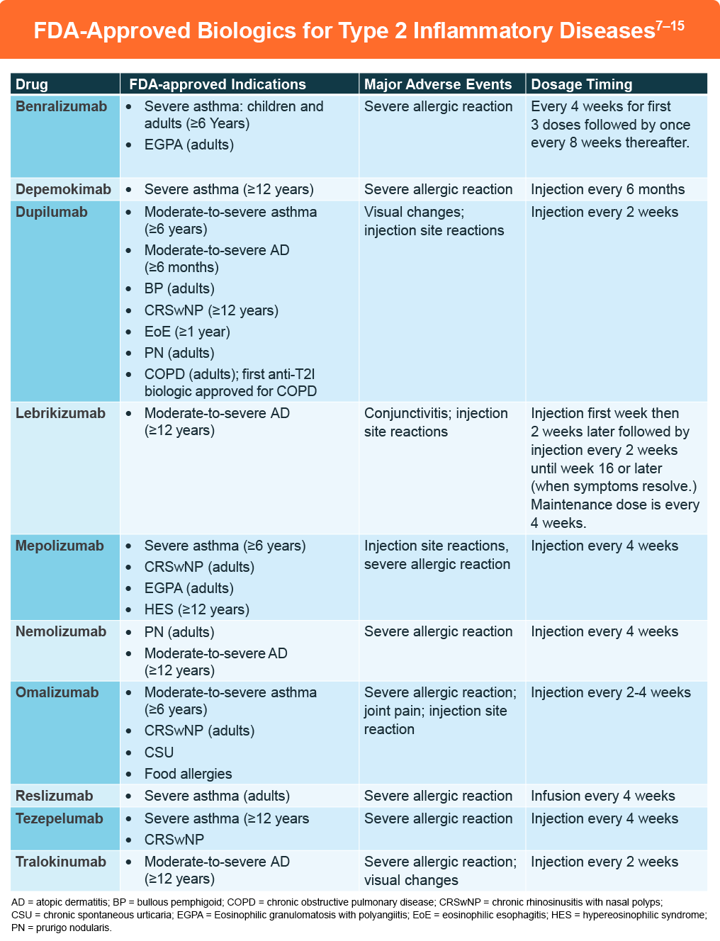 Below is a table that shows the available biologics and the diseases they are approved to treat. Selection of the medication best for you can depend on the condition and how severe it is, as well as additional factors, such as your age, if your condition requires persistent use of steroids, as well as any coexisting conditions also affected by T2I that might be present. Not all biologics are approved for every condition, nor for every age. All the medications listed (except reslizumab) require an injection, and most have pens and other devices that make it easier to give yourself the shot; reslizumab is given with an IV infusion. Common side effects for biologics are mild, including headaches and injection site reactions, although a few may also affect eye health.